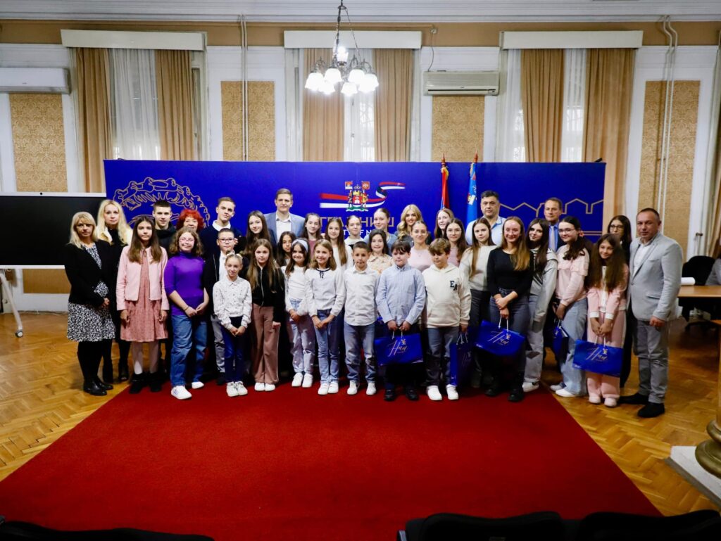 U svečanoj sali, u kojoj se donose važne odluke za grad, učenike su dočekali zamenik gradonačelnika Niša Luka Gašević i Ivana Cvetković, članica Gradskog veća zadužena za resor kulture.