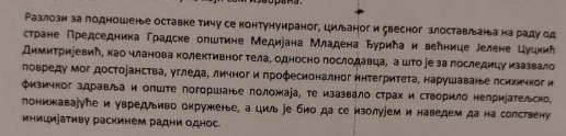 U svojoj pisanoj ostavci, Marija Đorđević navodi da je ključni razlog za napuštanje funkcije „kontinuirano, ciljano i svesno zlostavljanje na radu“ od strane predsednika GO Medijana Mladena Đurića i većnice Jelene Cuckić Dimitrijević.