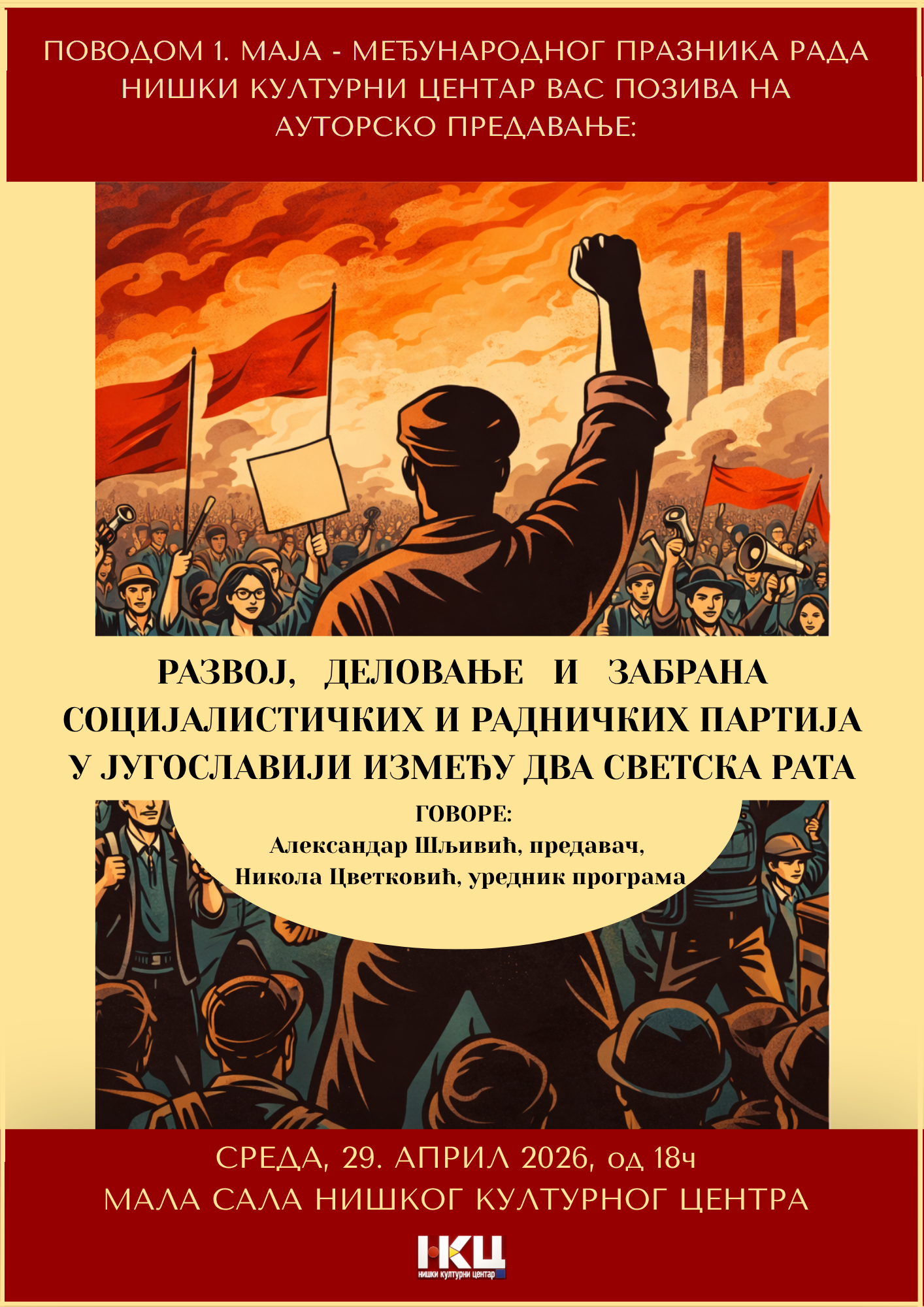 Niški kulturni centar organizuje autorsko predavanje povodom Prvog maja – Međunarodnog praznika rada, koje će biti održano u sredu, 29. aprila 2026. godine, u 18 časova u Maloj sali ove ustanove.