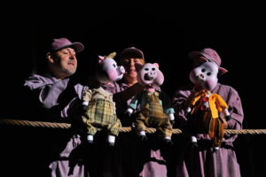 Predstava „Tri praseta“ donosi priču o drugarstvu, ljubavi i zajedništvu kroz doživljaje tri praseta čije bezbrižne živote remeti zloćudni i proždrljivi vuk. U želji da se zaštite, jedno prase gradi kuću od slame, drugo od pruća, a treće od cigala. Dok prve dve kućice vuk uspeva da sruši, treća odoleva njegovim napadima. Poučeni iskustvom, prasici nastavljaju da žive složno i opreznije.